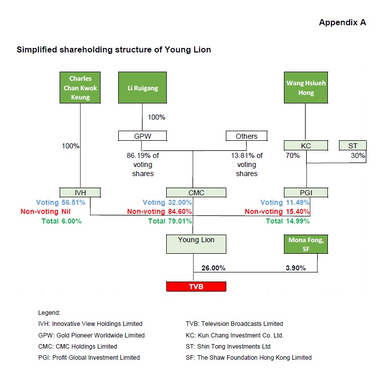 TVB’s offer announcement stated that Innovative View Holdings Limited (IVH), a company wholly-owned by Charles Chan Kwok Keung, holds 56.51% of the voting rights of Young Lion Holdings Limited (Young Lion), which in turn holds a direct interest in 26% of TVB’s shares and an additional 3.9% indirectly with its concert parties (Note 2). Young Lion stated that it did not intend to accept TVB’s share buy-back offer. The Young Lion concert group therefore applied to the Takeovers Executive for a Whitewash Waiver as its shareholding will increase from 29.9% to up to 41.19% as a result of TVB’s share buy-back and thereby a mandatory general offer will be triggered by the Young Lion concert group under the Takeovers Code.