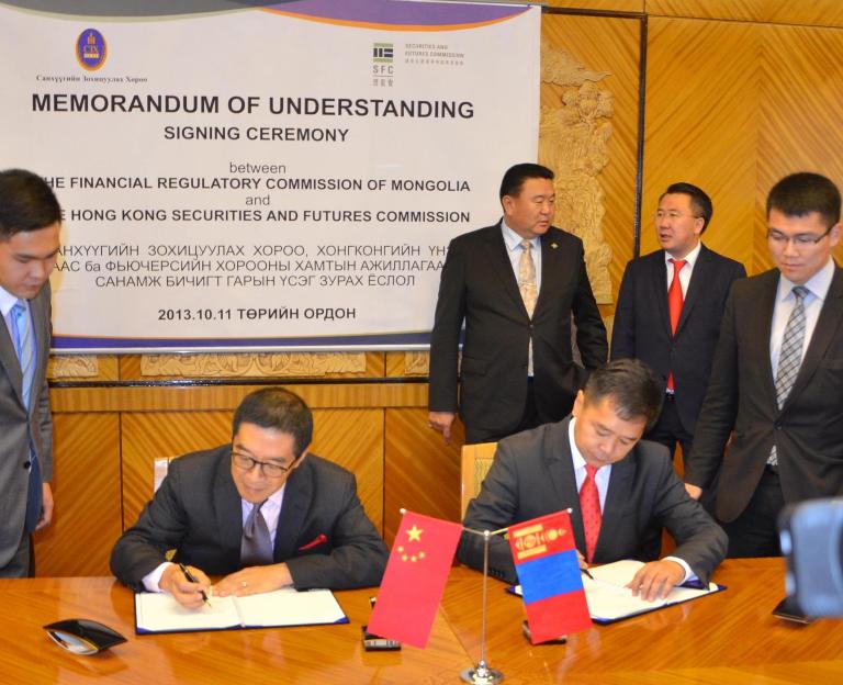 諒解備忘錄由證監會主席唐家成先生與蒙古金融監督委員會主席巴亞賽漢先生簽署,為兩家監管機構的相互協助設定框架及促進雙方信息交流。