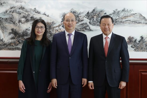 證監會主席雷添良先生(右)和行政總裁梁鳳儀女士(左)與中國證監會主席易會滿先生(中)在中國證監會北京辦公室會面。